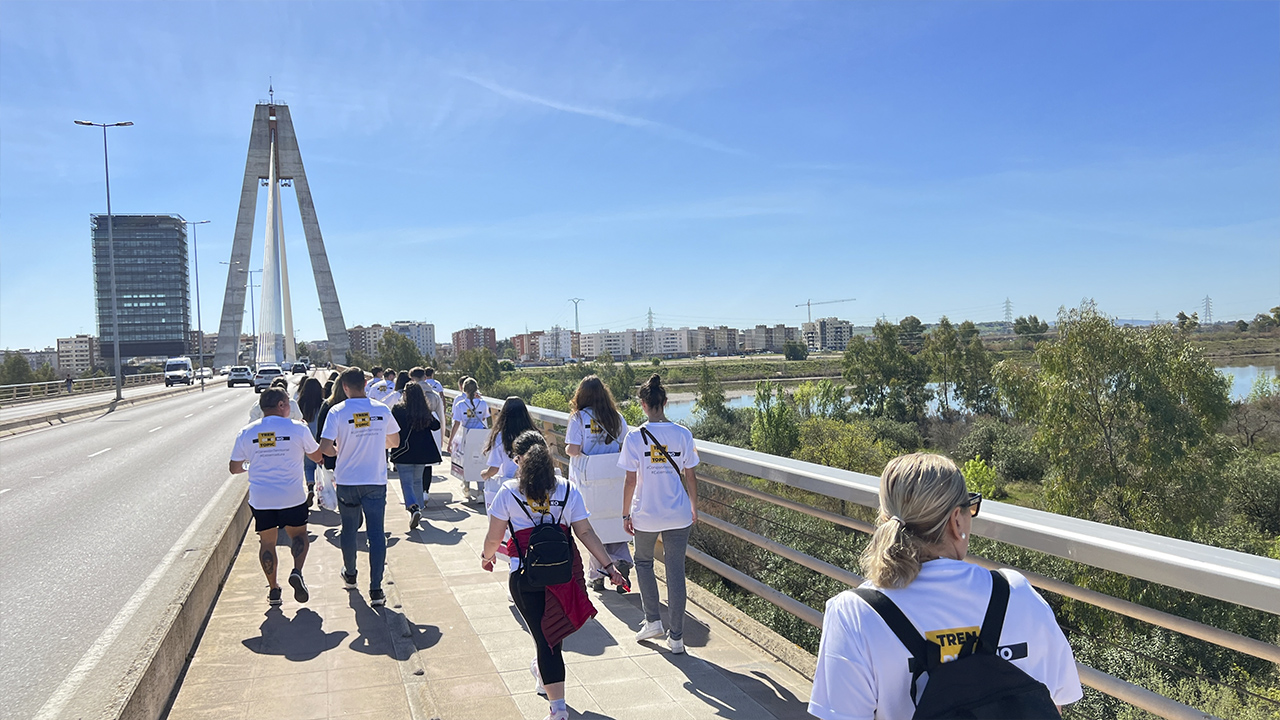 Por eso, este miércoles hemos realizado una marcha reivindicativa desde la RUCAB hasta el Edificio Badajoz Siglo XXI, donde a las 12.00 horas se ha celebrado el VI Foro Transfronterizo, Empresarial y Social del Corredor Sudoeste Ibérico. Durante la marcha llevamos las camisetas diseñadas para tal fin, donde nos hicimos notar y manifestar nuestro malestar con la situación que nos afecta.